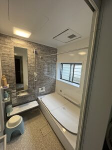 アクセントは落ち着いたグレーを持ってきました、浴室換気乾燥暖房器も設置し多機能で便利🎵